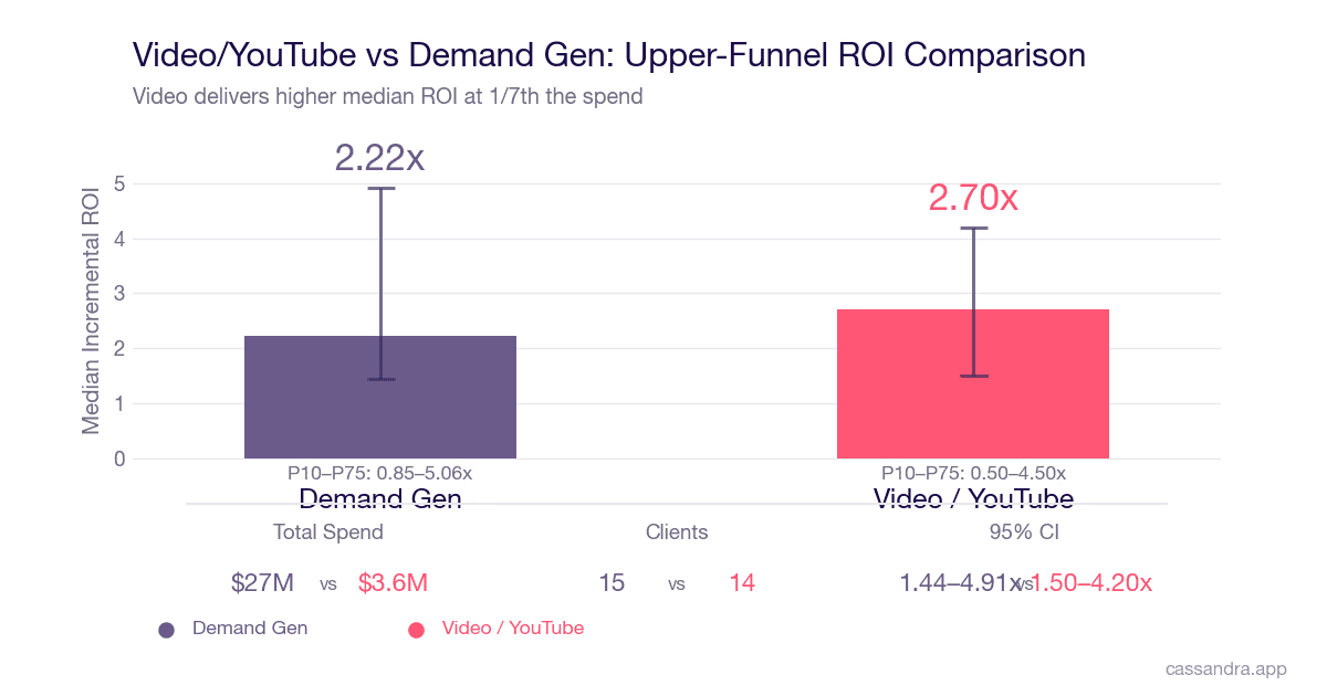 Video and Demand Gen carry more nuance than the negative narrative suggests. At 2.70x median incremental ROI, YouTube is competitive with social performance channels while reaching entirely different inventory. CPM costs remain significantly below Search for equivalent audience quality. The brands ignoring YouTube are leaving cheap reach on the table — and ceding brand equity ground to competitors who are showing up there. The brands building presence on YouTube now are the ones whose Search Brand ROI will outperform this dataset's median in three years.