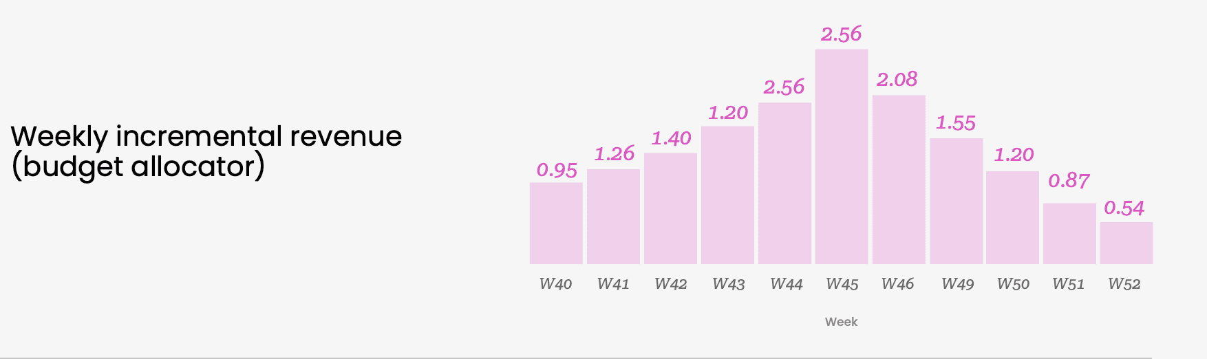 Run this week by week. The allocator outputs predicted revenue increase for each week. Sum those weekly predictions across Q4 to calculate your total expected uplift.
