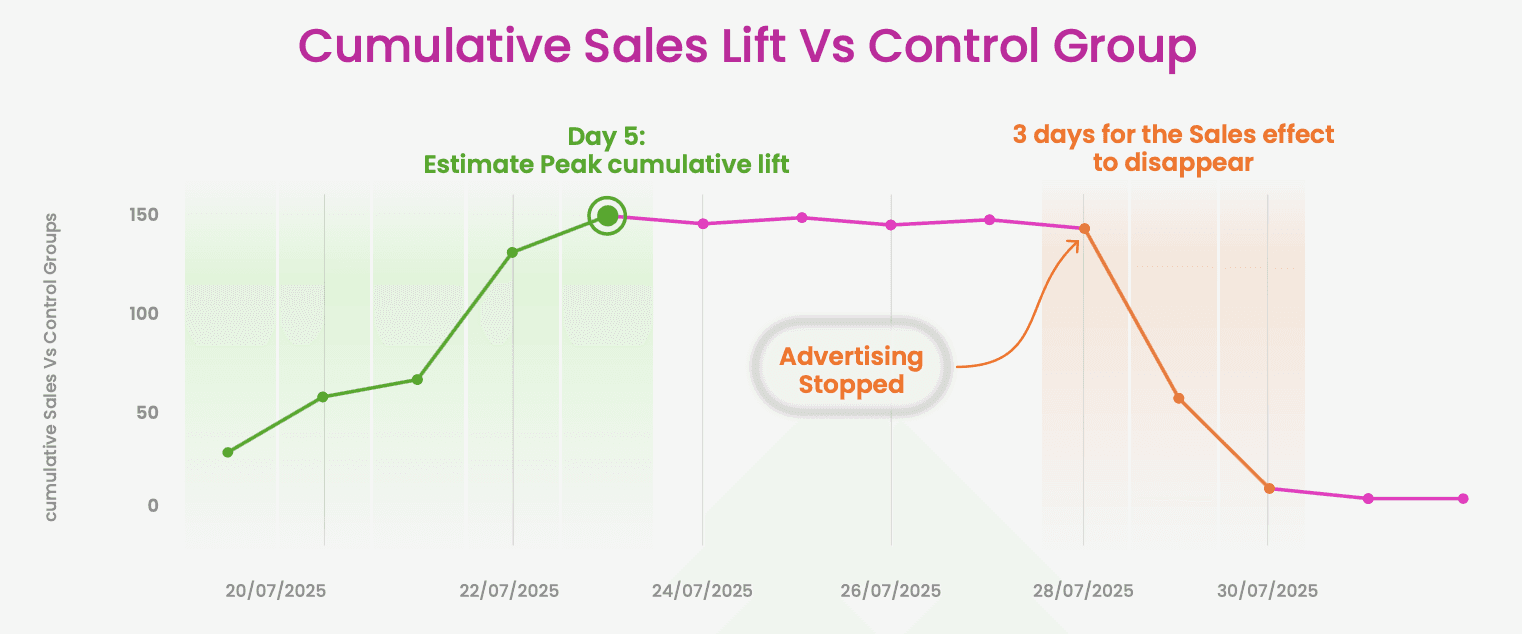 Step 4: Stop advertising in test regions after reaching peak effect. The time it takes for sales to return to control group levels is your carry-over effect.